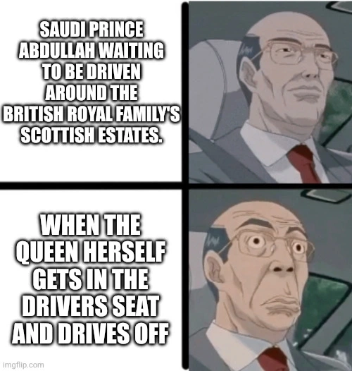 Context: In 1998, the Saudi crown prince Abdullah visited the UK, the Queen offered him a tour of their Scottish estate in a car. Expecting some attendant to do the driving, the prince was shocked when Queen Elizabeth herself got into the drivers seat and drove off.