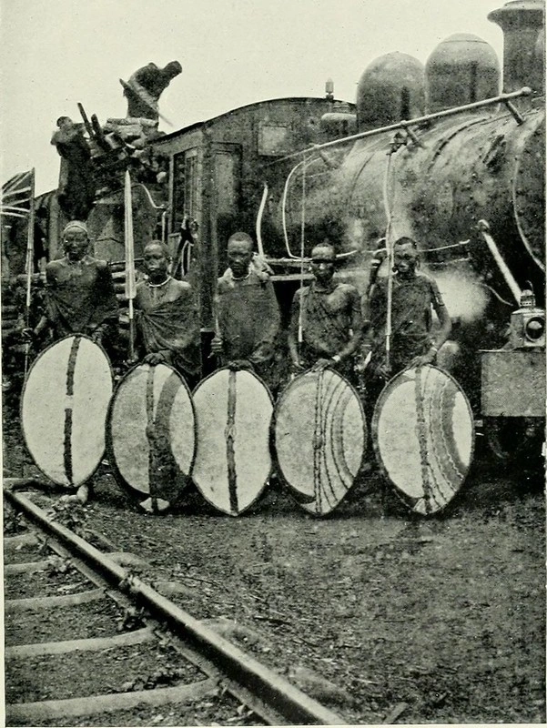 Maasai warriors alongside a train of the Ugandan Railway, British East Africa, ~1900